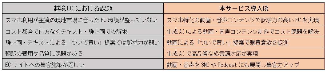 本サービスの最大の特長は、AIによる動画・音声コンテンツの自動生成です。短時間で気軽に楽しめるショート動画や、Podcast形式のPRコンテンツを展開可能。限られた画像やテキスト情報からでもPR動画やナチュラルな音声紹介が生成でき、現地消費者に直感的に伝わる訴求を実現します。